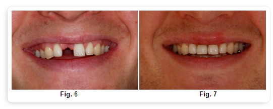 Observe en la Fig. 7 cómo es posible la imitación de los dientes vecinos. Evidentemente no sería estética una prótesis fija con dientes ¨ blancos ¨ si los dientes vecinos son oscuros y tienen colores y manchas diferentes.