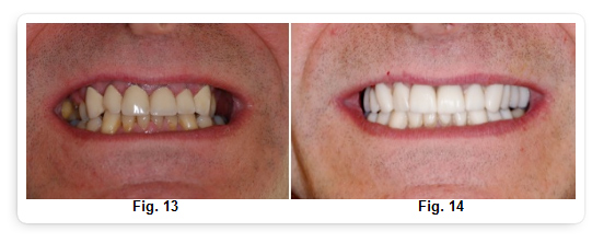 En la Fig. 13 observamos un tratamiento realizado con coronas no estéticas en los dientes superiores e inferiores y en la Fig. 14 la solución dada con otras coronas correctas. La diferencia es apreciable.